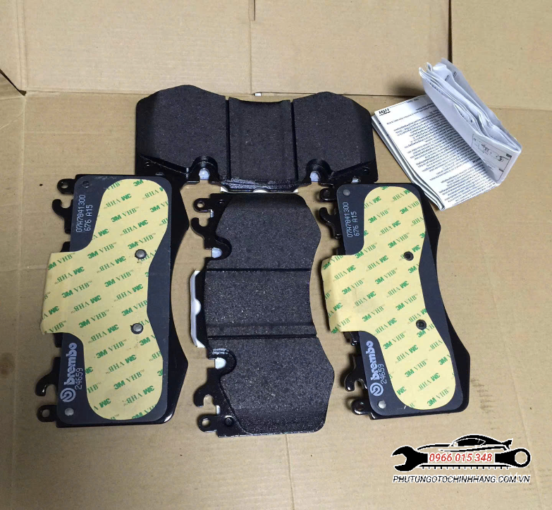 • Mặt sau má phanh: Có lớp keo 3M VHB màu xanh lá cây, giúp cố định má phanh vào piston phanh, giảm rung động và tiếng ồn trong quá trình phanh.